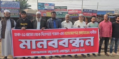 ঢাকা-১৯ আসনে এনসিপি প্রার্থীর মনোনয়ন প্রত্যাহারের দাবিতে আশুলিয়ায় মানববন্ধন