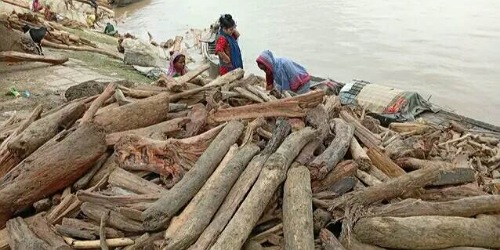 উজান থেকে ভেসে আসছে হাজারো গাছের গুড়ি, কুড়িগ্রামের নদীতে কাঠ তোলায় ব্যস্ত স্থানীয়রা
