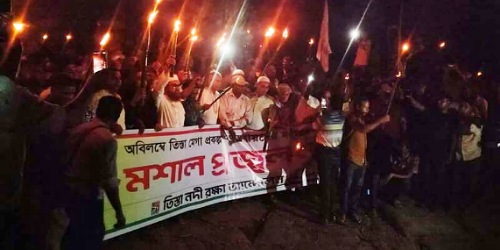 তিস্তার পানির ন্যায্য হিস্যা আদায়, ভাঙন থেকে তীরবর্তী বসতি ও কৃষিজমি রক্ষা, এবং তিস্তা মহাপরিকল্পনা দ্রুত বাস্তবায়নের দাবিতে নদীতীরে মশাল