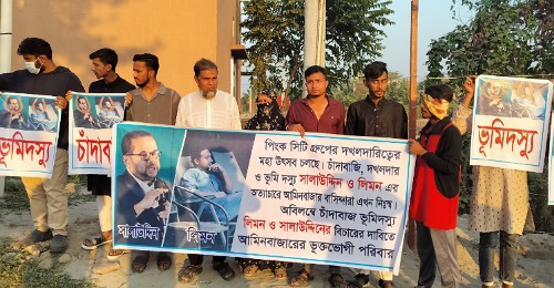 সাভারের আমিনবাজারে পিংক সিটির বিরুদ্ধে জমি দখলের অভিযোগে মানববন্ধন